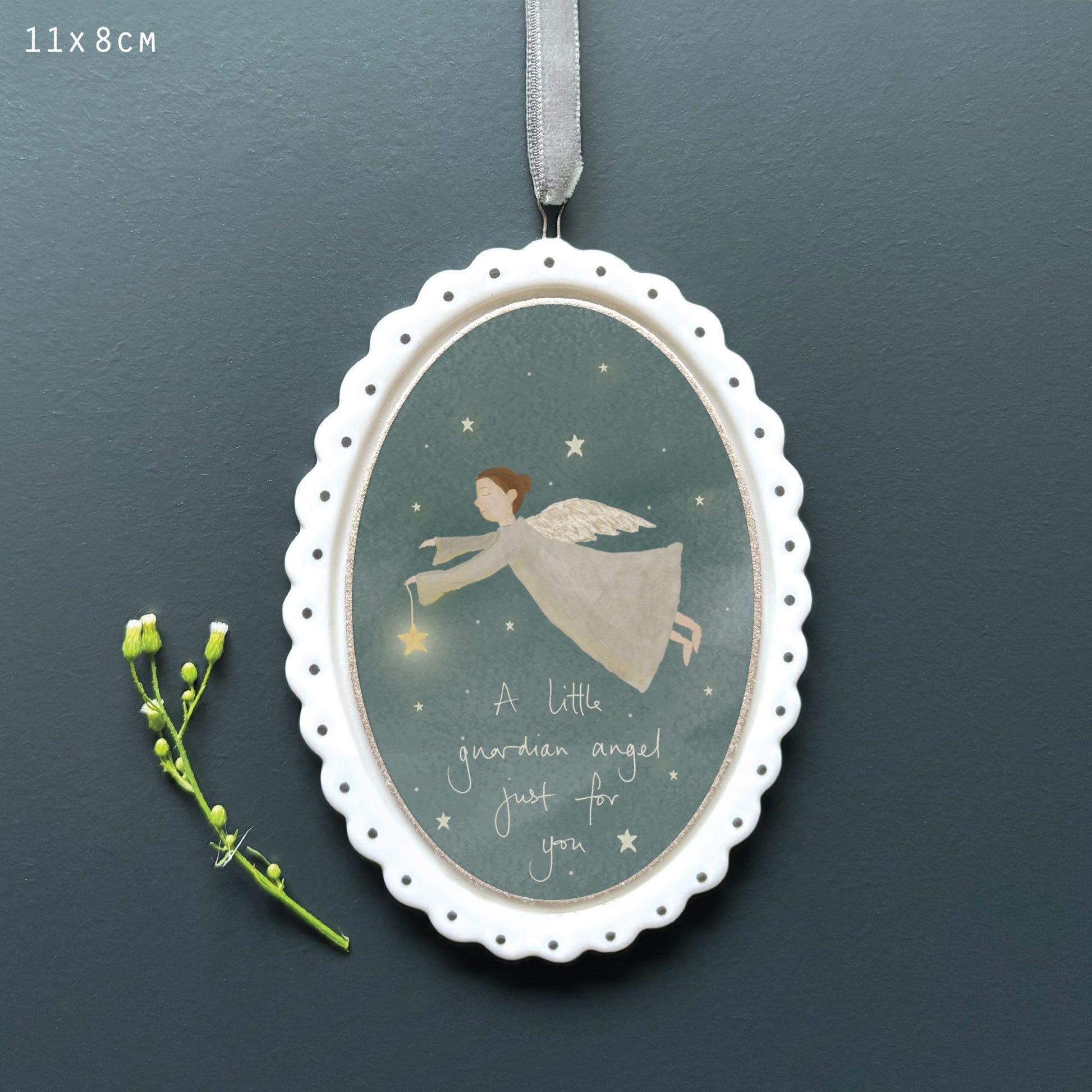 Elevate your home decor with our Scallop Oval Frame Guardian Angel. This porcelain hanging decoration features a beautiful Guardian Angel image and a heartfelt message. With its elegant scallop edge oval frame, it's the perfect reminder of a little guardian angel watching over you.