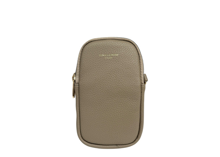 A beautifully soft phone handbag in gravel by David Jones Paris. The bag has a longer strap which adjusts and detaches from the bag. It has one main zip to open and three internal credit card slots.