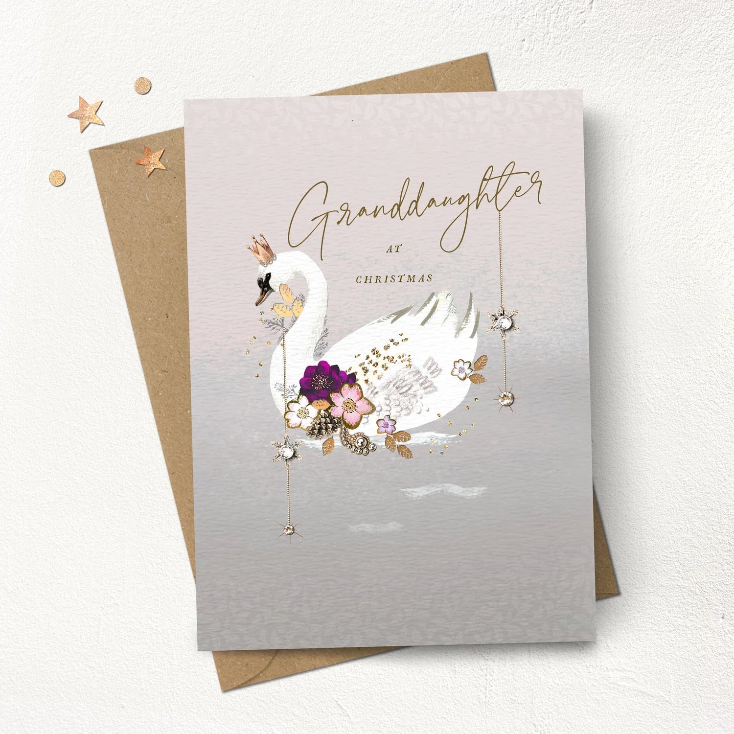 Send some love to your granddaughter with our Granddaughter Swan Christmas Card from the 'Winter Forest' collection. Featuring a beautiful swan sketch adorned with winter florals, hand finished with stamped copper foil and crystals. Our high-quality cardstock and recycled kraft envelope make this a sustainable choice. Designed and made with love in the U.K.