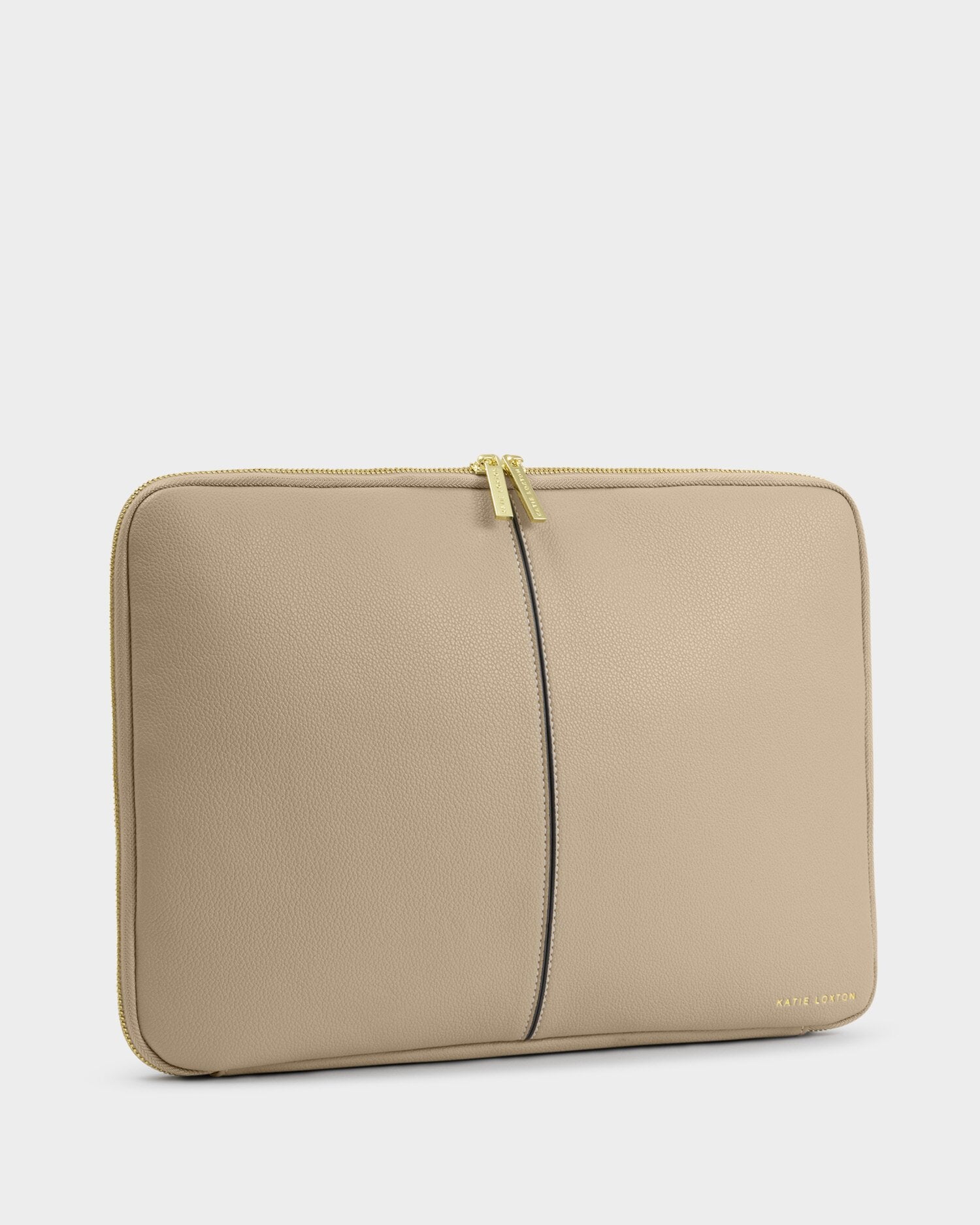 Introducing the Katie Loxton Folio Laptop Case in Taupe. Crafted from smooth vegan leather material, this case features a unique golden stamped sentiment and pockets for a notepad, charger, and stationery. Designed for the on-the-go commuter, it is compatible with laptops up to 15 inches. Stay organised and stylish with this quirky and functional laptop case!
